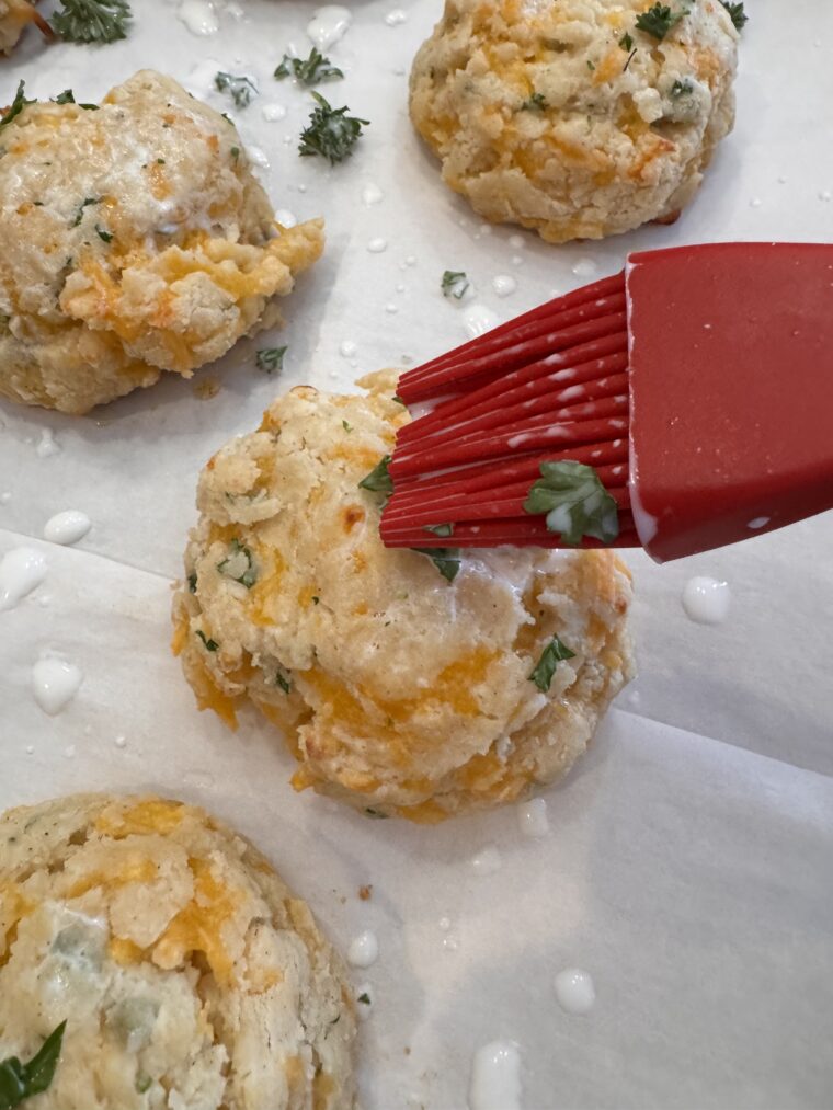 - Milk and Parsley– Chop the parsley and mix it together to brush over the biscuits before baking. Sprinkle the tops with a pinch of garlic powder to finish them.
